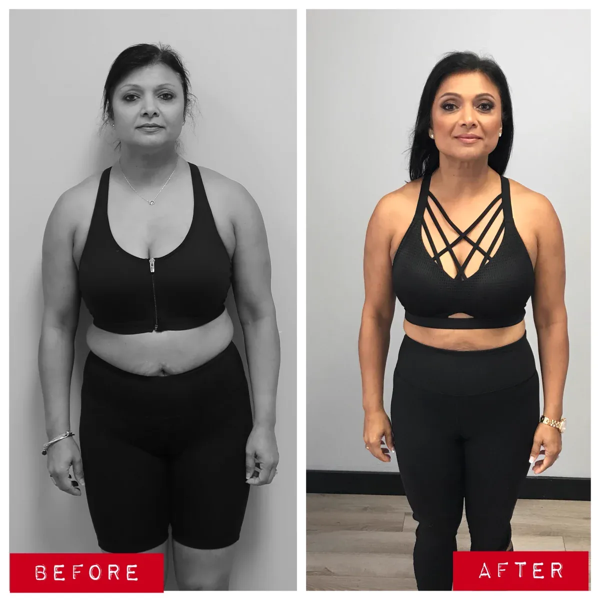 After joining the program and fully committing to the transformation, Sue remarkably went from 220 lbs to sporting a set of toned abs.