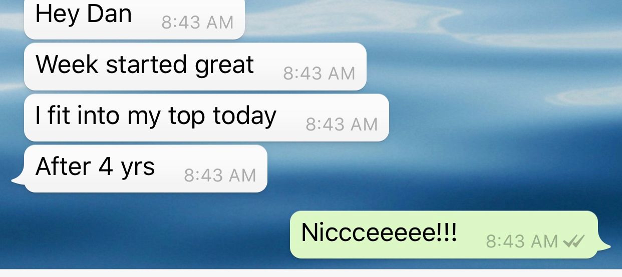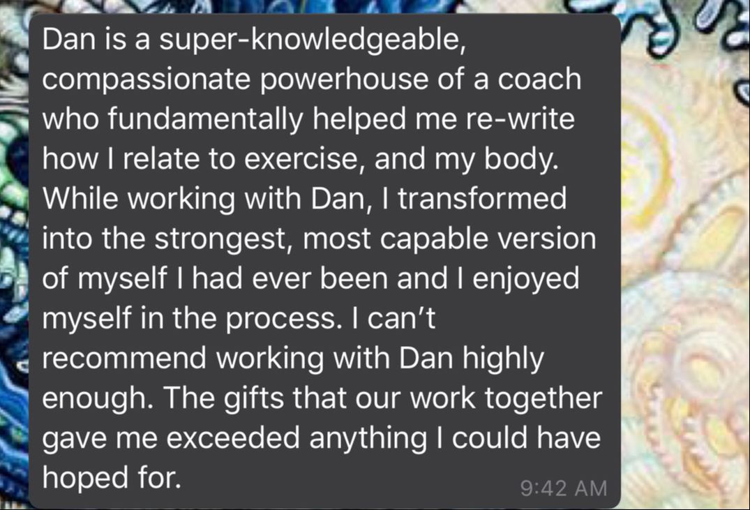 "Dan has been an incredible resource not just for common sense nutrition and exercise advice, but more importantly, in seeing how that advice can integrate into my day-to-day decisions. We all know we should stop eating junk food and exercise more. But Dan helped me understand why I continued to make the same unhealthy choices over and over, as well as strategize some practical solutions that could fit into my busy day-to-day life."