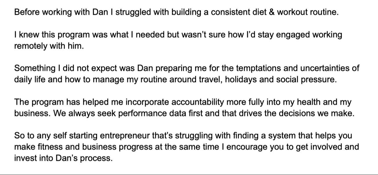 What most trainers do is give you a basic nutrition plan and coach you inside the gym for the hour you're with them. But what happens when you're outside of the gym? They don't text you to make sure you're following the nutrition plan. They don't find places for you to eat out at restaurants. They don't create workouts while traveling. They don't specialize in working with entrepreneurs and professionals.